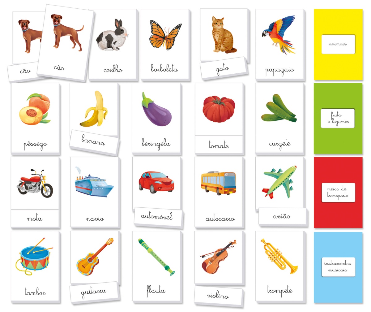 Contém também pastas de classificação para as palavras de acordo com os contextos a que pertencem: animais, instrumentos musicais, fruta e legumes, meios de transporte.
