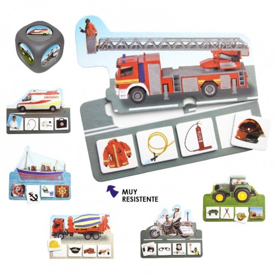 Este é um jogo de associação que consiste em completar 6 veículos de diferentes profissões com 4 elementos próprios de cada profissão. Podem participar no jogo até 6 jogadores ao mesmo tempo. Possui um sistema autocorrectivo no verso que consiste numa figura geométrica comum a todos os objectos relacionados com cada veículo.